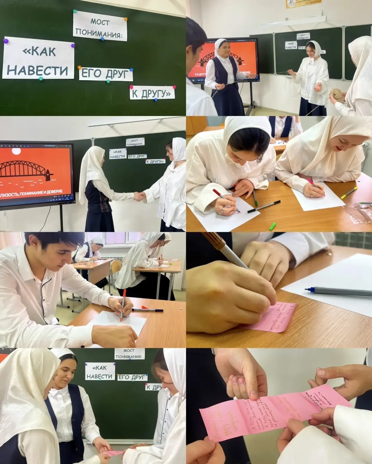 В ходе занятия старшеклассники приняли участие в ряде упражнений:• «Путаница»— задание на взаимодействие и командную работу.• «Слушаем молча»— практика активного слушания без перебиваний и оценок.• «Я и мой друг»— работа направленная на эмпатию и осознание чувств собеседника.• «Мой кирпичик в “Мост понимания”»— каждый участник обозначил, что именно он может принести для создания атмосферы уважения и взаимопонимания в классе.