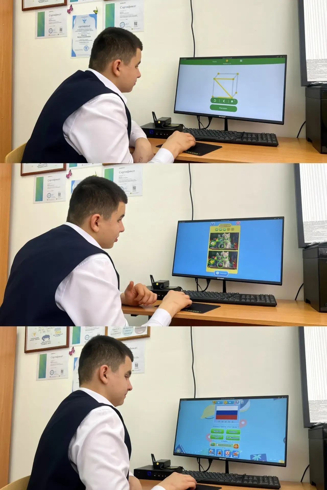 28.01.2026Педагогом-психологом с обучающимся 9 класса проводятся индивидуальные занятия 1 раз в неделю.Занятия направлены на развитие познавательных процессов: внимания, памяти, мышления, зрительно-пространственного восприятия, а также на формирование навыков самоконтроля и произвольной регуляции деятельности.В ходе занятий используются компьютерные развивающие игры и упражнения, способствующие повышению учебной мотивации и поддержанию устойчивого интереса к деятельности. Игровые задания направлены на тренировку концентрации внимания, переключаемости, зрительной и слуховой памяти, логического мышления.Обучающийся включается в работу, проявляет интерес к заданиям, старается доводить начатую деятельность до конца. Отмечается положительная динамика в скорости выполнения заданий, понимании инструкции и удержании внимания.