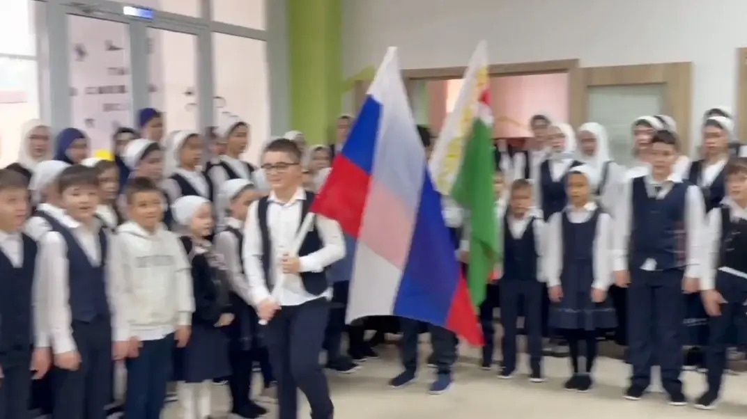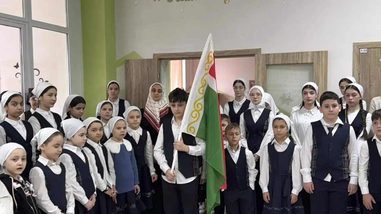 09.02.202609.02.2026 в школе прошла еженедельная общешкольная линейка с торжественным поднятием флагов Российской Федерации и Чеченской Республики под исполнение государственных гимнов.